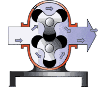 羅茨風機在機殼內部設置有兩組互朝相反方向回轉的葉輪,在葉輪與葉輪,及葉輪與機殼間僅留有極小縫隙的狀態下回轉。當其中一組葉輪葉端經過吸入口時,與殼體之間捕捉的一定量的空氣,自吸入側移送至吐出側,壓向高壓端。吸入側之空氣,葉輪旋轉至與殼體的最小間隙時所捕捉的空氣被移送至吐出口開口處,在上圖所示狀態下吐出。