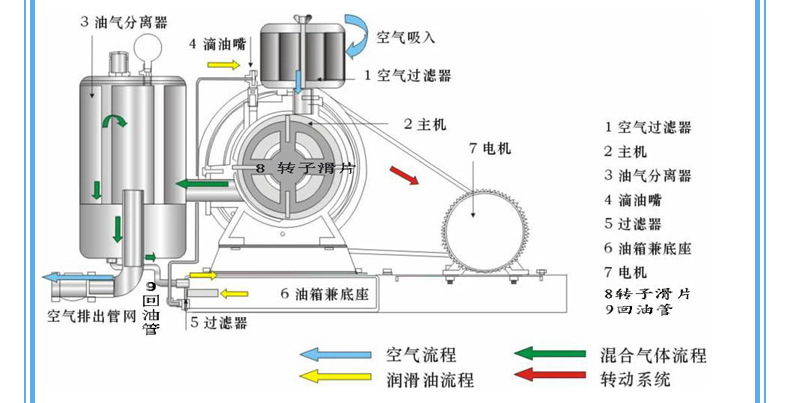 偏心裝在氣缸體內的轉子旋轉時,使轉子槽內的4根葉片產生往復運動,將空氣吸進、壓縮、排出,構成風機、葉片和轉子、氣缸體相互磨擦,產生熱。所以風機運轉時,由滴油嘴往氣缸體內滴入必要的潤滑油使表面潤滑,以減小磨擦熱和磨擦噪音;并使部件之間形成一層油膜,保持風機的密封性。潤滑系統是利用風機工作時產生的壓力差而形成的自動供給機油的循環裝置,因此回轉風機不能空負載運轉!